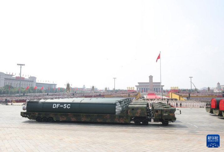 3日上午的阅兵分列式中,核导弹第二方队的12台大型导弹运输车载着“东风-5C”液体洲际战略核导弹压轴出场。电视直播解说提到,“东风-5C”打击范围覆盖全球,全时戒备、有效威慑,以武止戈、砥定乾坤。
